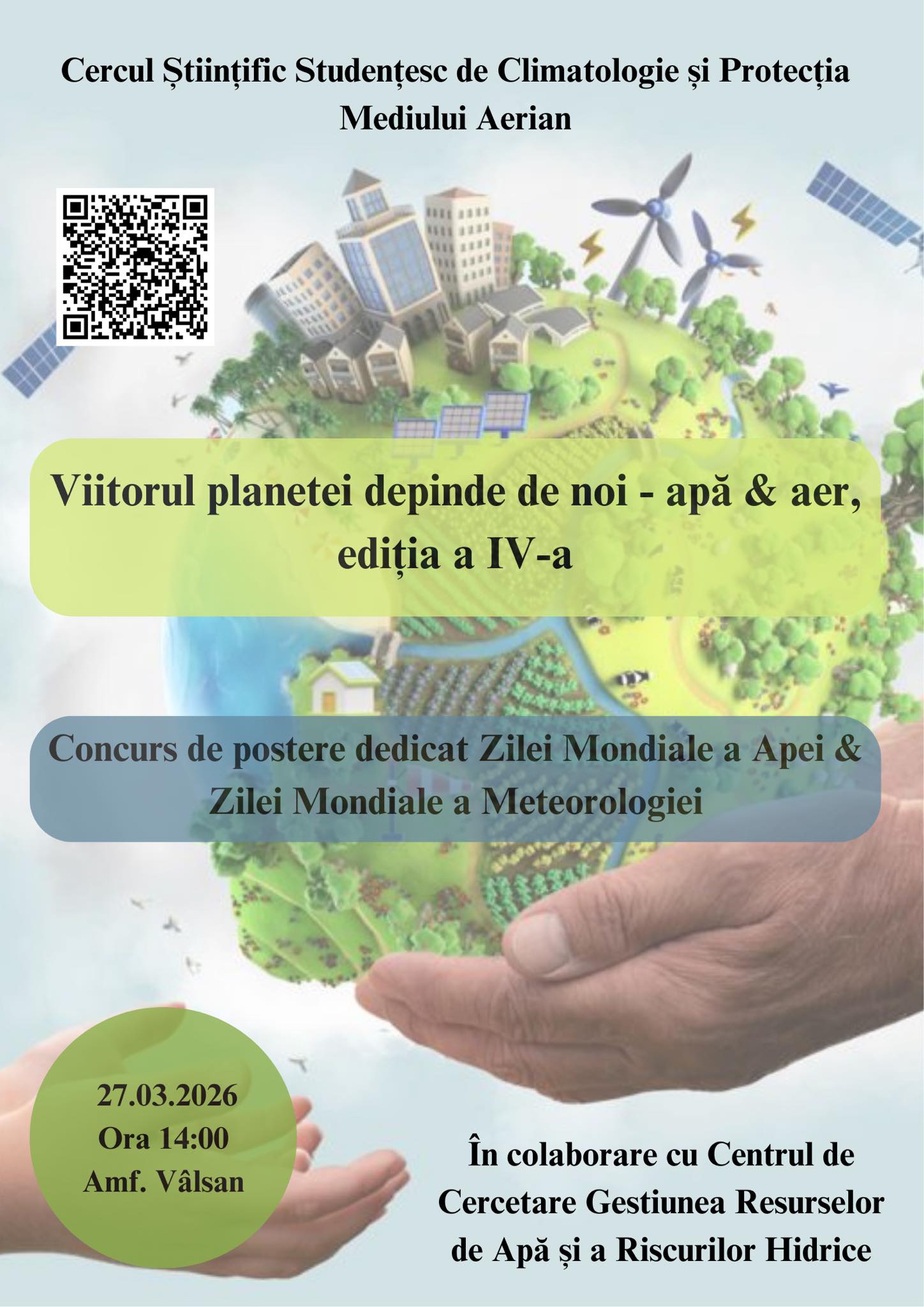 – Cercul Științific Studențesc de Climatologie și Protecția Mediului Aerian – Concurs de postere pe tema „Viitorul planetei depinde noi – apă & aer”, ediția a III-a, dedicat Zilei Mondiale a Apei – 22 martie și a Zilei Mondiale a Meteorologiei – 23 martie