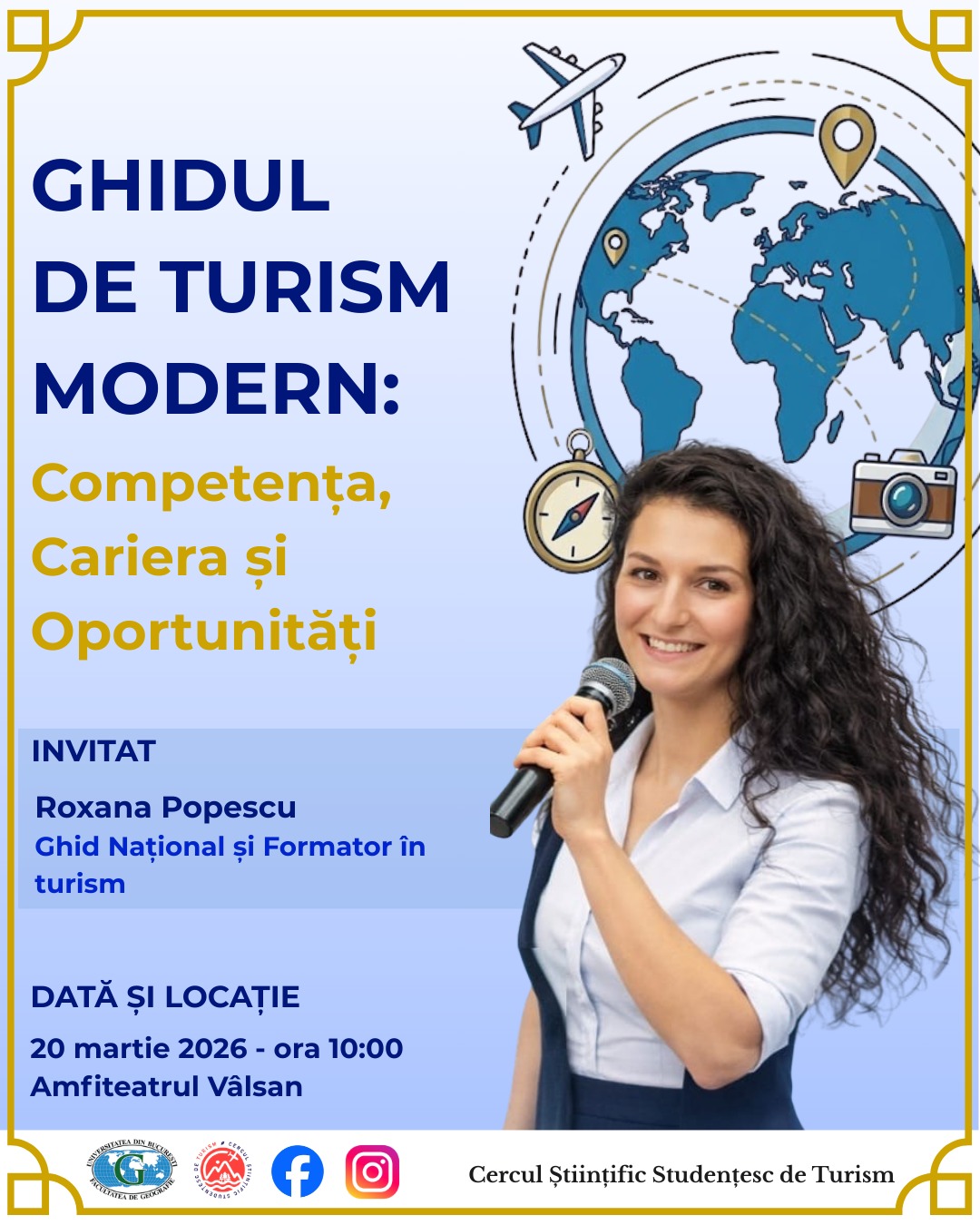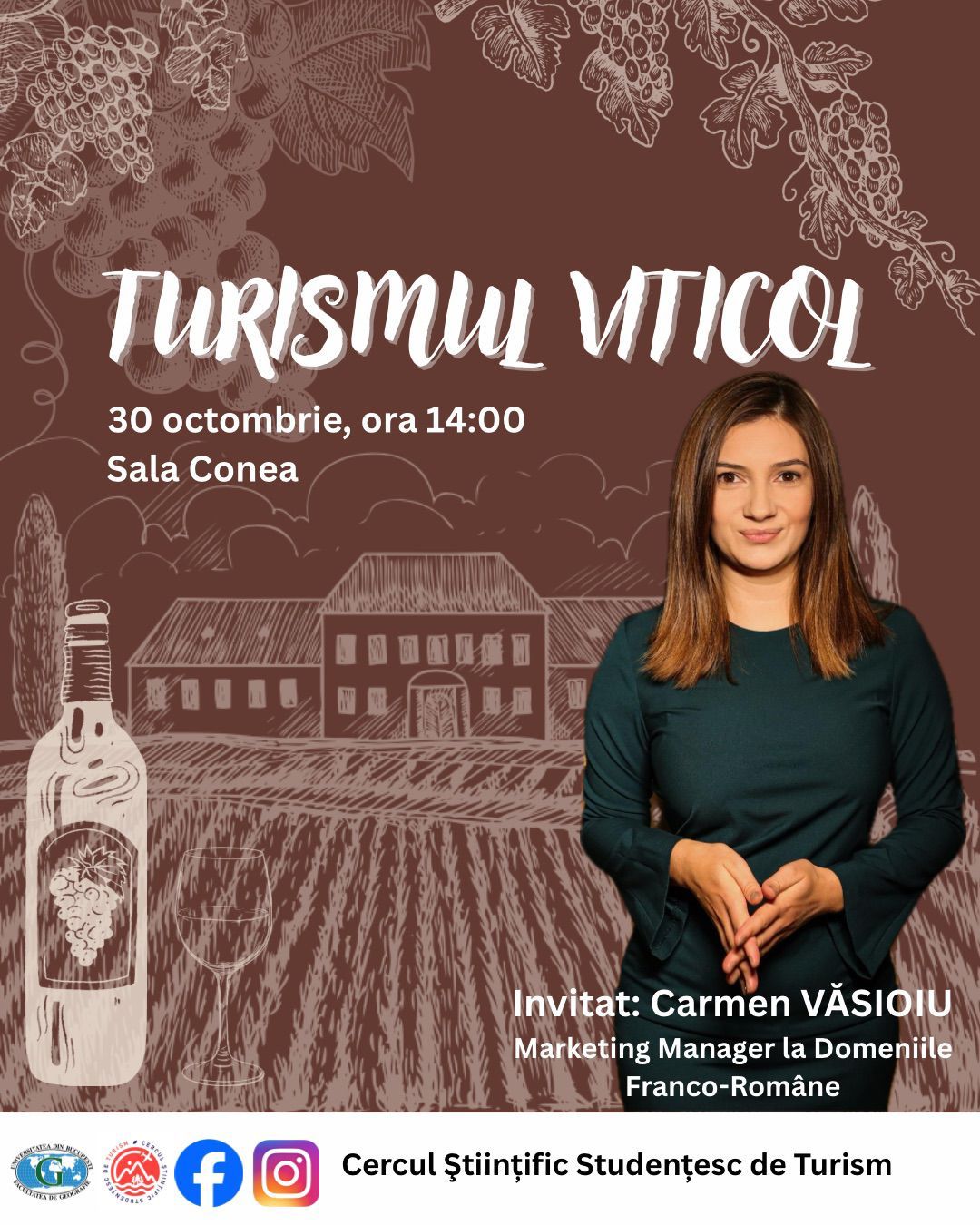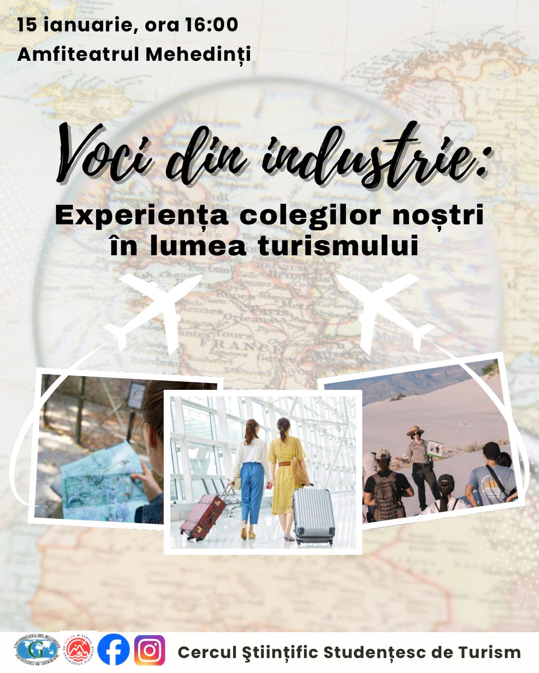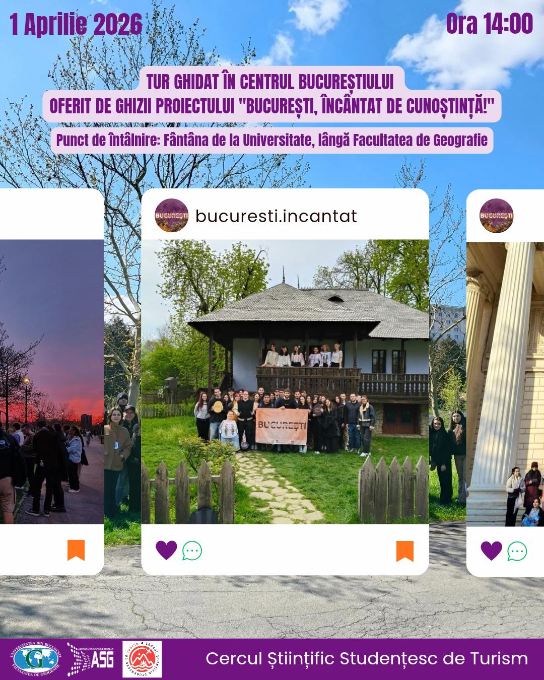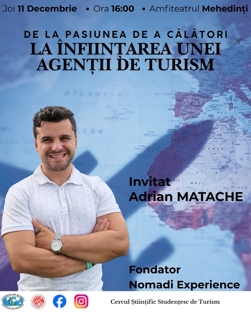 – Întâlnire Cercul Științific Studențesc de Turism – 04 Decembrie 2024, ora 18:00, Amfiteatrul Mehedinți (Invitate: Cătălina ANDRIEȘ — co-fondator al Muzeului Comunismului și al Bucharest by Foot Tours, ghid de turism și profesor de geografie și turism; Gabriela SANDU — ghid de turism la Muzeul Comunismului și Bucharest by Foot Tours)