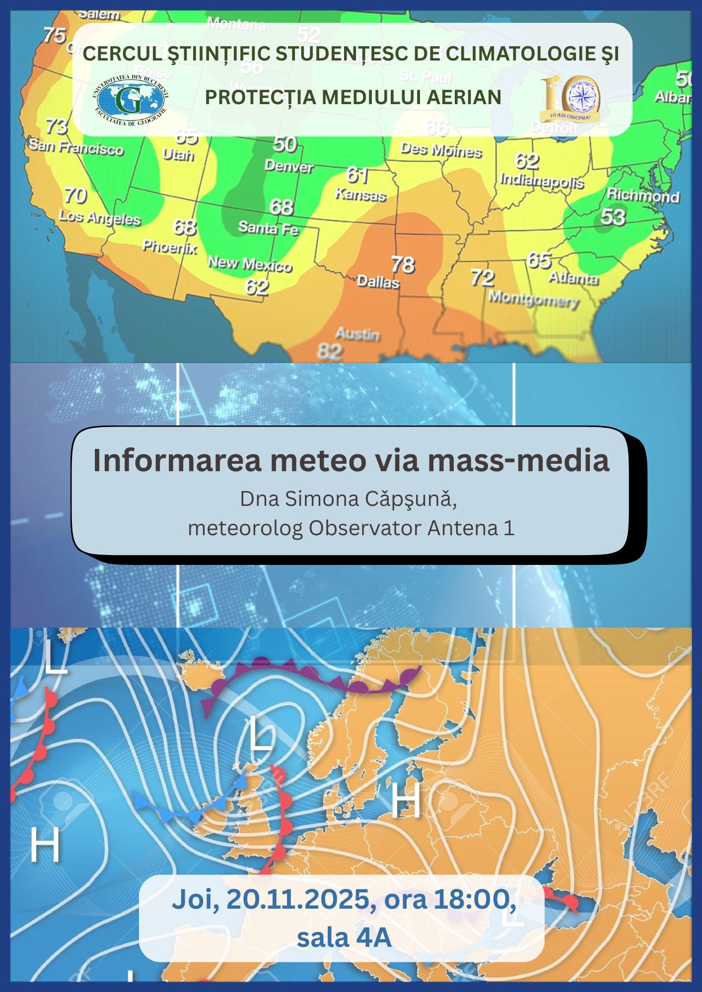 Întâlnire CSSCPMA – joi, 20 noiembrie 2025, ora 18:00, sala 4A („Informarea meteo vis mass-media” – Invitat: Dna Simona Căpșună, meteorolog Observator Antena 1)